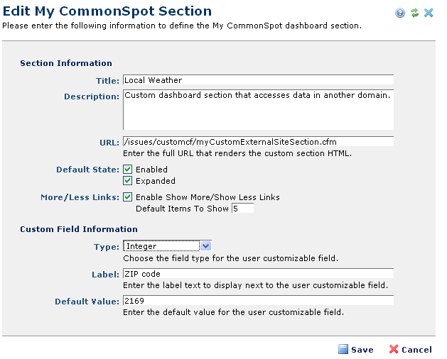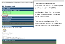 You can customize the My CommonSpot workspace with one or more panels. For example, you might share a convenient set of links as shown below. Creating a custom section is simply a process of using this dialog to supply CommonSpot with a valid URL to display within the My CommonSpot dashboard. Typically, this URL points to a custom file you create using ColdFusion or the language of your choice. Your custom page can reside in any web-accessible location within your domain. To serve content from another domain, point your custom section URL to a local script that uses CFHTTP or another mechanism to request and return outside content.