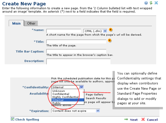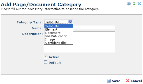 Use the Add Page/Document Category dialog to create custom subcategories for pages, documents, and dynamic content produced for your site. Subcategories defined here display to content contributors in the Create New Page and Standard Page Properties dialogs as part of the page creation/change process.