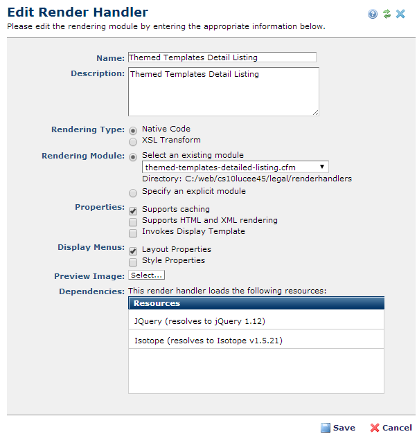 For existing render handlers, this dialog displays in edit mode, as shown above, and contains the following fields: