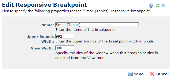 Upper Bounds Width: Enter the upper bound width of the breakpoint in pixels. The upper bound width is the largest width of that breakpoint. For example, your responsive framework might consider a device as "small" if the window size is between 768 and 992 pixels. In this case the Upper Bound Width is 992 pixels.