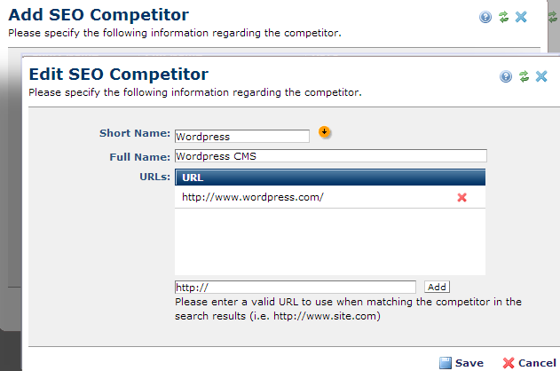 This dialog displays when you click either the Add SEO Competitor link or the edit icon