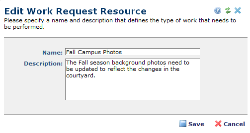 Click Add Work Request Resource in the Work Request Resources dialog to define a new work type, or click the edit icon for an existing type, to correct errors or change information, as shown below.
