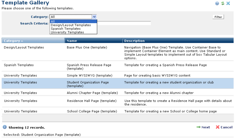 2. Browsing the CommonSpot Template Gallery to choose a template that contains or best accommodates content requirements.