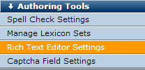 Use the Rick Text Editor Settings dialog to control the type and level of functionality available to content contributors. For example, you can show/hide HTML and other editing options, configure style sheet handling, spellcheck, and HTML cleanup and conversion settings.
