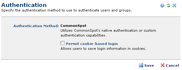 Permit cookie-based login: Optional. Available for CommonSpot native authentication. Enables browser-based cookie authentication for read access to CommonSpot content. This setting allows sites requiring registration to automatically log in returning users. This feature is not designed for CommonSpot contributors. Contributors changing from read to author mode when viewing cookie-authenticated pages receive a CommonSpot prompt for credentials.