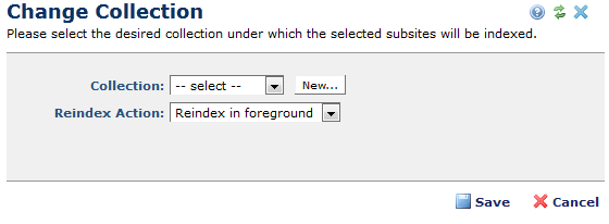 Use this dialog to change the collection under which subsite members are indexed. Access this dialog from the Collection Members dialog by selecting one or more subsites, selecting the Change Collection option from the More Actions dropdown and clicking Go.