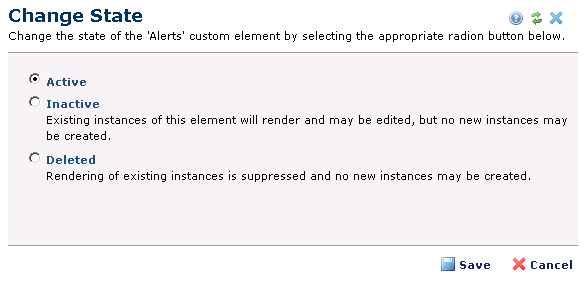 Manage Elements gives you options for activating, deactivating, or deleting the Element, as described below. You cannot apply these options to CommonSpot factory Elements. "Deleting" suppresses rendering of existing instances and disallows new instances, but does not remove Element data from the system.