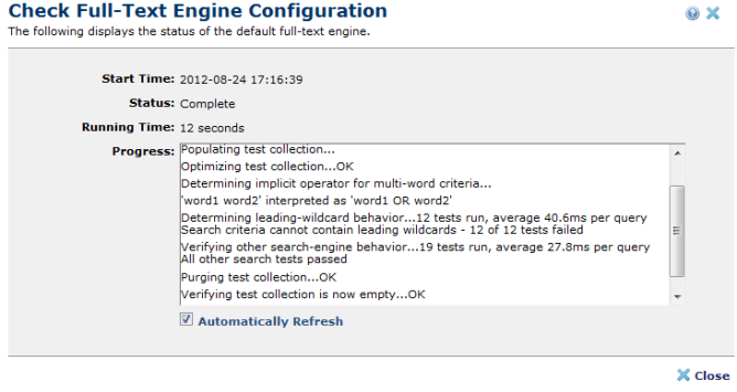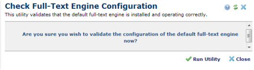 You are here: Administrators Reference > Server and Customer Administration > Server Administration Left Panel > Utilities > Server Tools > Check Full-Text Engine Configuration