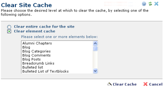 Use the Clear Site Cache option to refresh your site after page, template, or Element changes or after CommonSpot upgrades. Click in the center panel of the Site Administration Dashboard. The Clear Site Cache dialog displays.