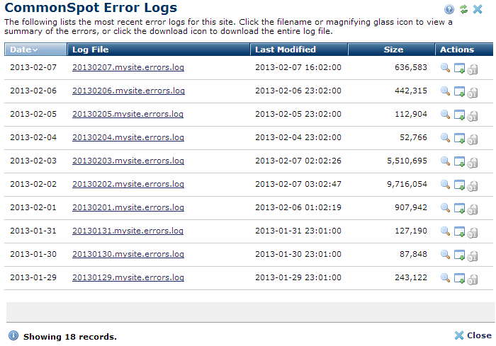 In the Actions column, click the preview icon to see a summary of the CommonSpot error log file, or click the download icon to save a local copy of the complete log file for review. Note that these files can become very large. For files greater than 10MB only the download option is available.