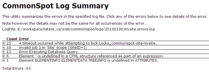 You are here: Administrators Reference > Site Administration > Utilities > CommonSpot Error Logs > CommonSpot Log Summary