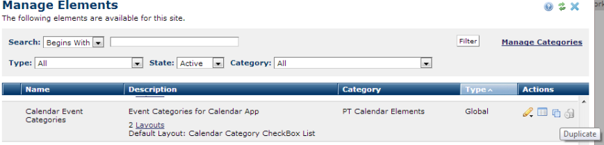 You can only copy Custom Elements. Click the copy icon from the Manage Elements dialog.