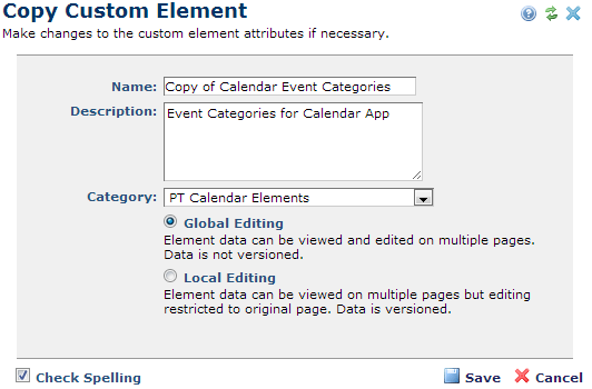 Save or change data for the copied Element. See New Custom Element for a description of fields contained in this dialog.