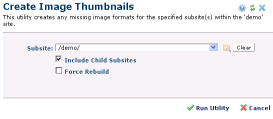 By default, this utility does not run immediately. Check Force rebuild to ensure that all image content is refreshed. Click Run Utility to build image files or Cancel to exit without running the utility.