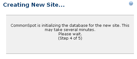 This dialog displays as the next-to-last-step when you are creating a site. CommonSpot displays it when you complete the New Site Database Information dialog, and it indicates that the site is being created.