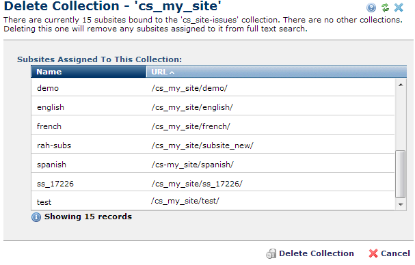 Click to sort by column head. Review the subsites affected, and click Delete Collection to delete this collection from all listed subsites or Cancel to exit without deleting.