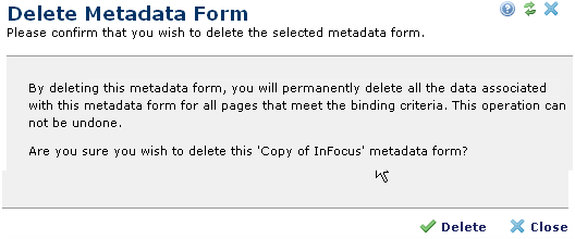 Delete Metadata forms from the Metadata Forms dialog. Select the form to delete and click the delete icon