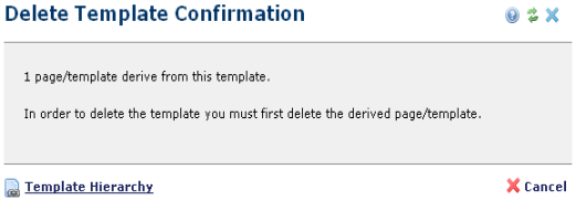 You cannot delete templates with active dependencies, as shown above. Click Template Hierarchy (this is discussed in the CommonSpot Content Contributors Reference) to view a list of these dependencies. Once you remove either affected pages and templates or remove dependencies, return to delete the selected template.