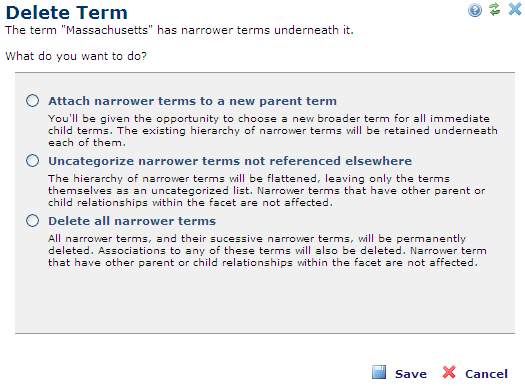 Select a new parent term for the orphaned narrower terms and click Save to recategorize them or Cancel to exit without saving.
