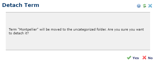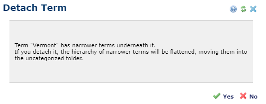 Click Save to save the term and related child terms in the Uncategorized Terms folder or No to exit without removing parent and child terms from current associations.