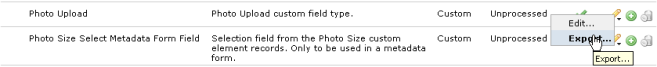 In all cases, the edit menu for Manage Elements, Metadata Forms, or Field Types and Masks, displays an export option as shown below, for exportable objects.