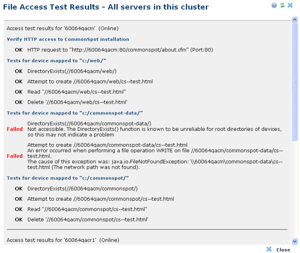Access this dialog by expanding Shared Database in the left panel of the Server Administration Dashboard and clicking Test all Connections. Use this to verify that CommonSpot has permissions required for file operations on all Read-Only Production servers in your cluster.