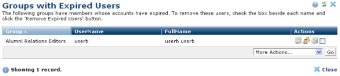 To help you flush expired users from membership in specific groups, CommonSpot provides a report for this purpose. Click Group Administration from the Admin menu, then click the View Groups with Expired Users link at the bottom of the dialog to open the report.