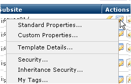 Security: Displays type-specific security settings for the selected item.  Options displayed to authors derive from administrative settings.  See “Page Security,” “Template Security,” “Image Security,” and “Uploaded Document Security" in the CommonSpot Content Contributor's Reference, as well as Site General Security and Content Security.