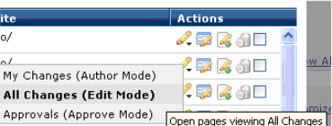Select a viewing mode. Selecting My Changes or All Changes, as shown above, opens a selected page or template for editing. Selecting Approvals opens the page for review in Approve mode.