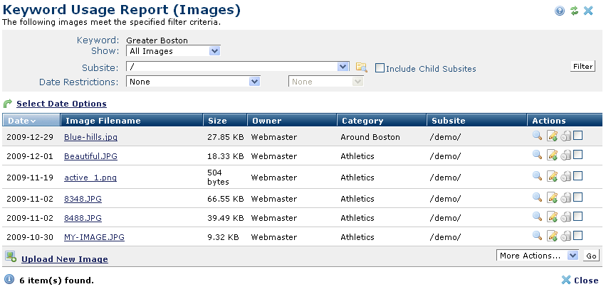 Click to sort by date, name, image size, owner, the category assigned to the image, or subsite location.