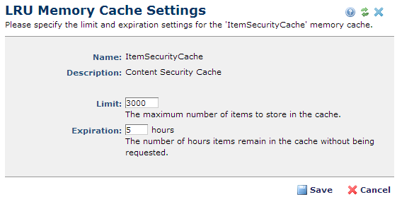 Click the edit icon for a cache object in the LRU Memory Cache report to view or set limits for the number of cached items or to set the expiration period for unrequested items.