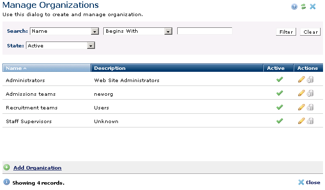 Use the Manage Organizations dialog to view currently defined organizations and to add, edit, or deactivate organization definitions. Optionally use this as an additional way to classify users.