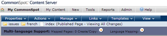 Once multiple languages are enabled for your site through Subsite Admin - Properties - Language, the following options display in the CommonSpot menu bar to contributors with authoring rights: