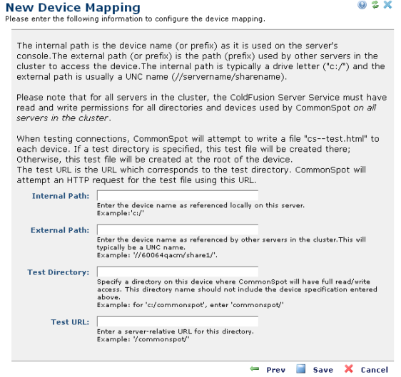 (Shared devices) The UNC name (\\imageServer\imageShare) or the mounted device name (/imageDevice). This name must be valid for all servers in the cluster and all servers in the cluster must have read/write permissions for all directories used by CommonSpot.