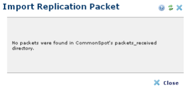Then navigate to the CommonSpot Site Administration dashboard, expand the Replication section, and click Import Packet. Use the Import Replication Packet dialog to pick up the replication process where it ended.