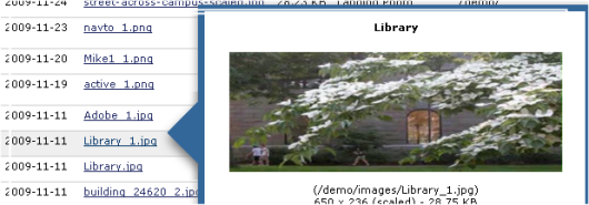 Click to sort by column head.  Mouseover an item in the Image Filename column for popup preview, as shown below: