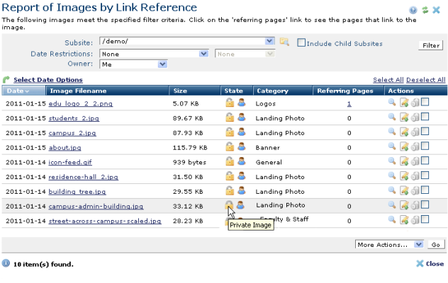 The State column indicates status for each image in this report. A lock icon indicates a private image, as shown above; unlock icons indicate public images. Click to change. You can also lock/unlock images multiple images by choosing Make Private/Make Public from the More Actions dropdown described below.