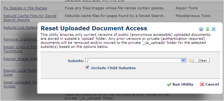 You are here: Administrators Reference > Site Administration > Utilities > Site Tools > Reset Uploaded Document Access