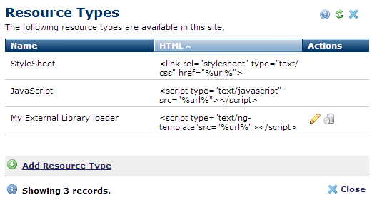 Access this dialog from the Resources/Libraries section of the Site Administration Dashboard to view or add the code required to load libraries or resources used for your site. CommonSpot includes factory code for loading JavaScript and Cascading Style Sheet resources. You cannot remove or modify these types. Sites with special resource needs can add types.