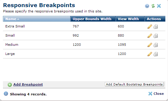Breakpoints define the width at which content responds, or "breaks", to give visitors the best possible layout for viewing content. Each breakpoint corresponds to the display size for commonly used devices, such as cell phones, tablets, laptops and minis, and desktops. Use this dialog to enter the breakpoints for the grid system that your site uses. The breakpoints you enter here control display width for previewing content for multiple devices. See the description of View menu options in the Contributors Reference.
