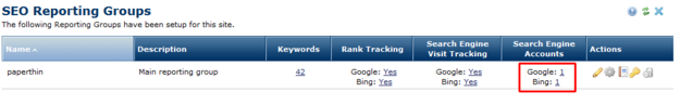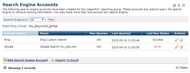 The Search Engine Accounts dialog shows all the search engine API accounts that have been set up for querying search results for the selected Reporting group.
