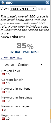 To ensure that your content is optimized for search engines, you can apply rules that score and grade specific page content and metadata components and give contributors recommendations to improve overall page score.