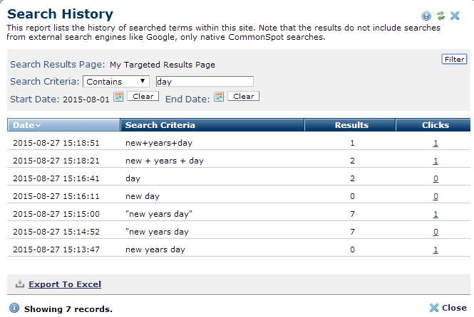 CommonSpot returns results within the period defined for maintaining search history.