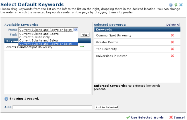 You can restrict your view of existing keywords to those within, above, or below the current subsite level, or maximize results by searching both above and below.