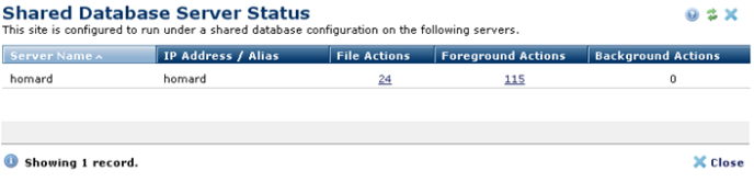 From the Site Administration left panel, expand the Shared Database panel and click Server Status. This dialog lists any Read Only Production Servers (ROPS) out of sync with the Authoring Server and displays the number and type of updates required to bring the server up to date. Use this dialog to review the level of change needed to bring a new or recently offline ROPS in sync with the authoring server.
