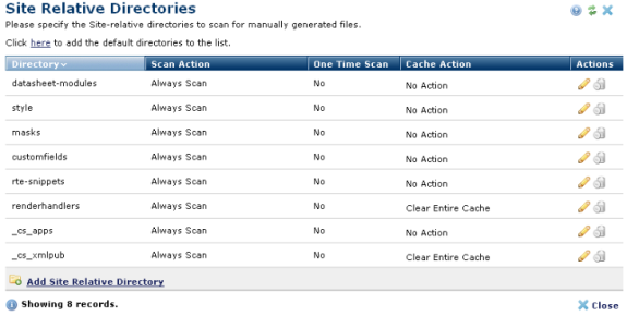 On an Authoring server, access this dialog by clicking to expand Replication in the left panel of the Site Administration dashboard and selecting Site Relative Directories. Use this option as a shortcut for automatically including commonly replicated directories in your scans. This dialog provides an editable list of each Site Relative directory registered for scanning. You can set scan frequency, whether this is a one-time only or regular scan, and the cache-clearing action taken for each scan event.