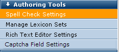 Access Spell Check Settings by expanding the Authoring Tools option in the Site Administration left panel. Use these options to determine whether users can create their own lexicons, and to set default spellcheck state for dialogs that contain the spellcheck option.