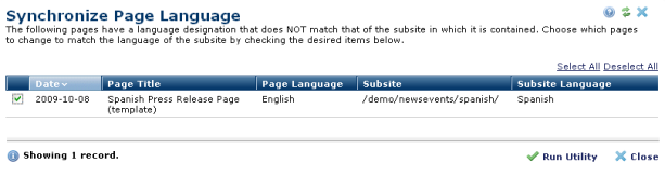 Use this utility to update the language specification for any page whose language differs from the subsite in which it is contained. Use this only if you're building multi-language sites. This option first generates a list of pages that are not in sync with their parent subsite. Select the pages to update to the parent language and click Run Utility. Synchronize Page Language updates all marked pages.