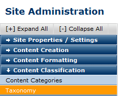 To access Taxonomy options, expand Content Classification in the left panel of the Site Administration Dashboard and click Taxonomy.