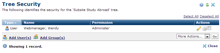 Use this dialog to view, change, or set new permissions for Tree menus available to users at your site. Access this dialog by clicking the security icon
